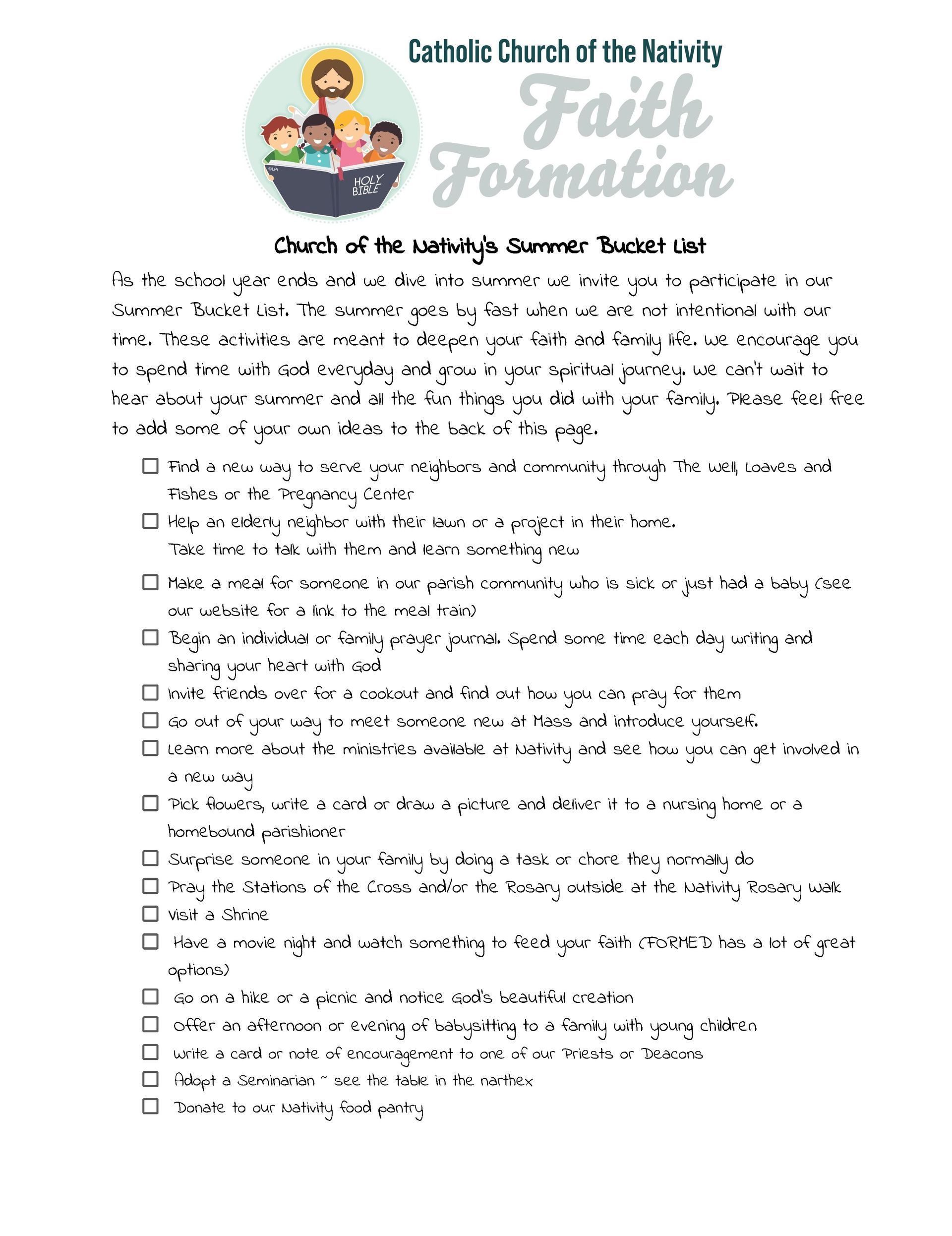 Church of the Nativity's Summer Bucket list is available again this year. Complete 10 or more items on the list, have a parent sign it, drop it off before July 23rd and you will be invited to an Ice Cream Party with Father Jerry and Father Cyriac after the 5pm Mass on July 27th. You can pick up a copy from the table in the narthex (at the top of the stairs) or downstairs at the Faith Formation Office. You can also print a copy by clicking the buttons below.